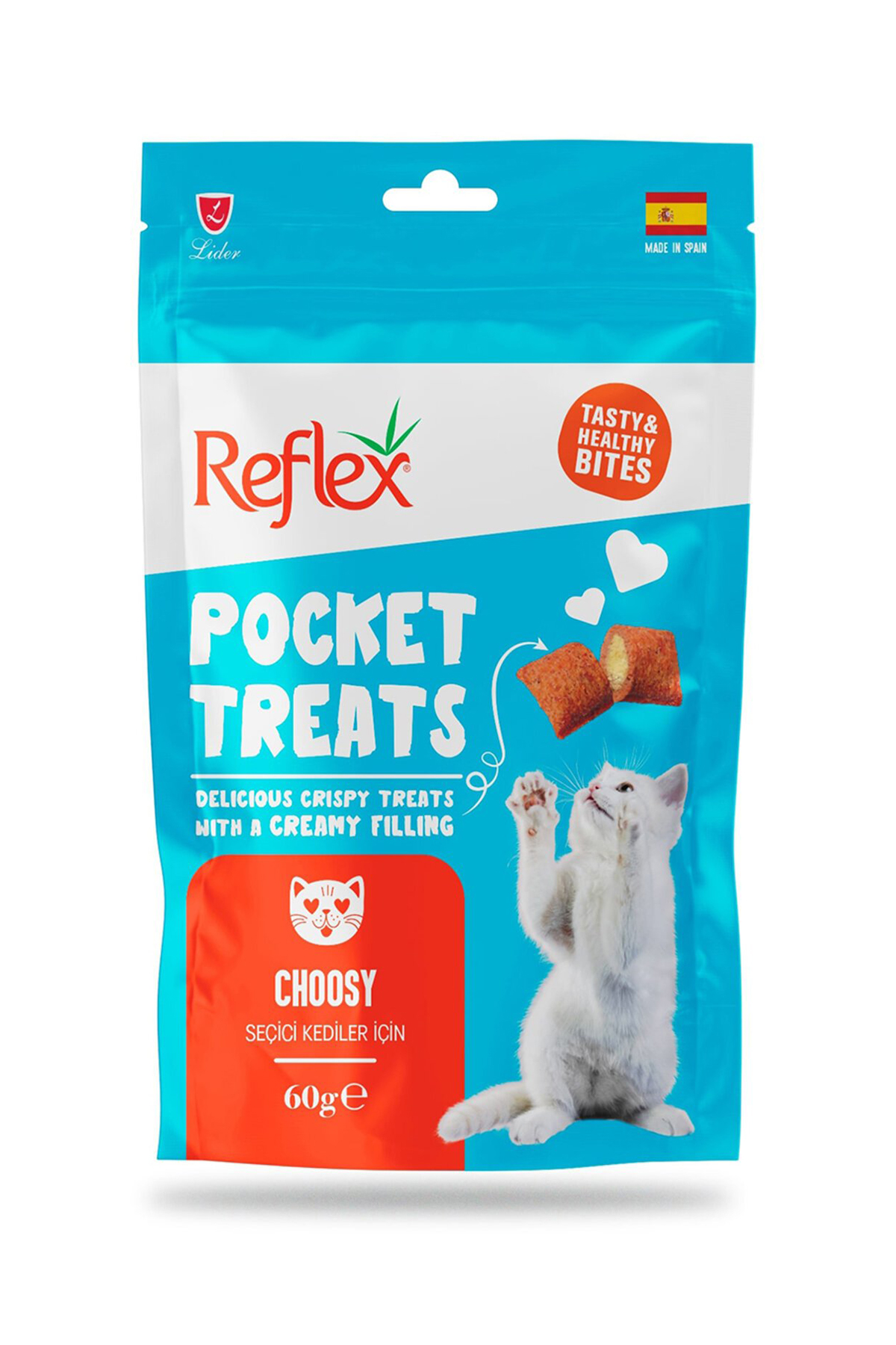 Kısa bilgi: Reflex Pocket Treats Choosy, seçici kediler için özel olarak formüle edilmiş, yüksek lezzetli ve besleyici bir ödül mamanın 60 gramlık pratik paketidir. Kedinizin damak tadına hitap ederken ek besin kaynağı sağlar ve eğitim sürecinde kullanılabilir.