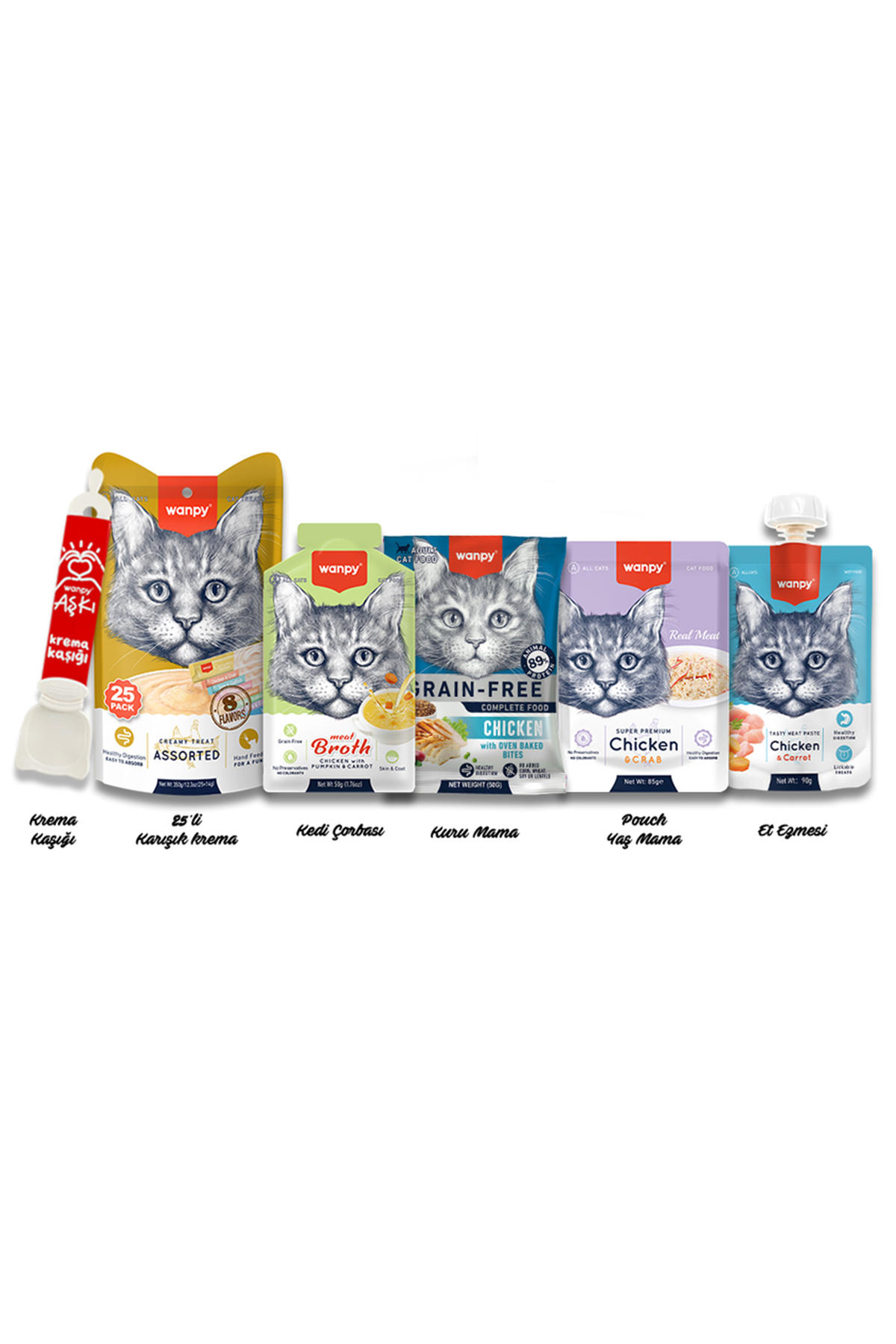 Wanpy Kedi Krema Avantaj Paketi, kremadan çorbaya, yaş mamadan ödül mama çeşitlerine kadar kedinizin günlük beslenmesini zenginleştiren eksiksiz bir set sunar. Bağışıklığı destekler, sıvı alımını artırır ve tüy sağlığını korur.